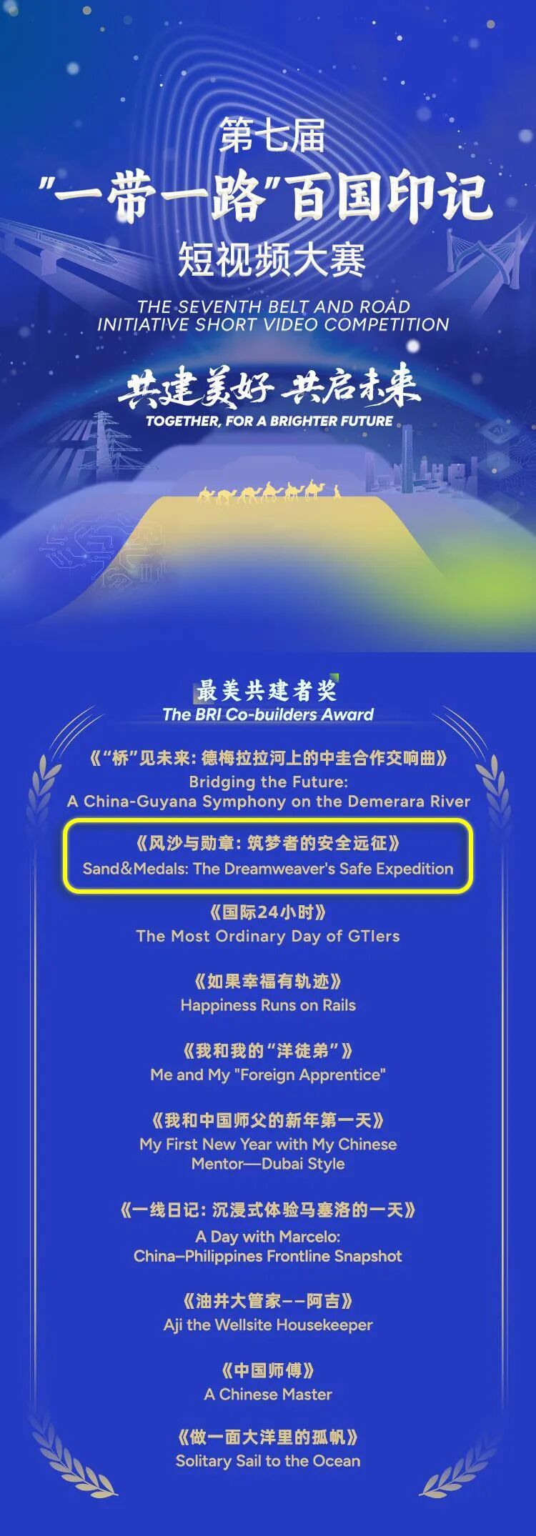 日前,,,,,,由中国公共外交协会、举世网团结主理,,,,,,国务院国资委新闻中心、中国驻柬埔寨王国大使馆、柬埔寨王国驻华大使馆、中国驻南非共和国大使馆、中国驻保加利亚共和国大使馆、中国驻塞尔维亚共和国大使馆支持的第七届“一带一起”百国印记短视频大赛落下帷幕,,,,,,大赛以“共建优美,,,,,,共启未来”为主题,,,,,,吸引了来自全球130余个国家和地区的近2000部作品参赛。。。。。。经由强烈角逐,,,,,,共有161部作品脱颖而出,,,,,,非凡国际集团短视频作品《风沙与勋章:筑梦者的清静远征》荣获“最美共建者”奖。。。。。。