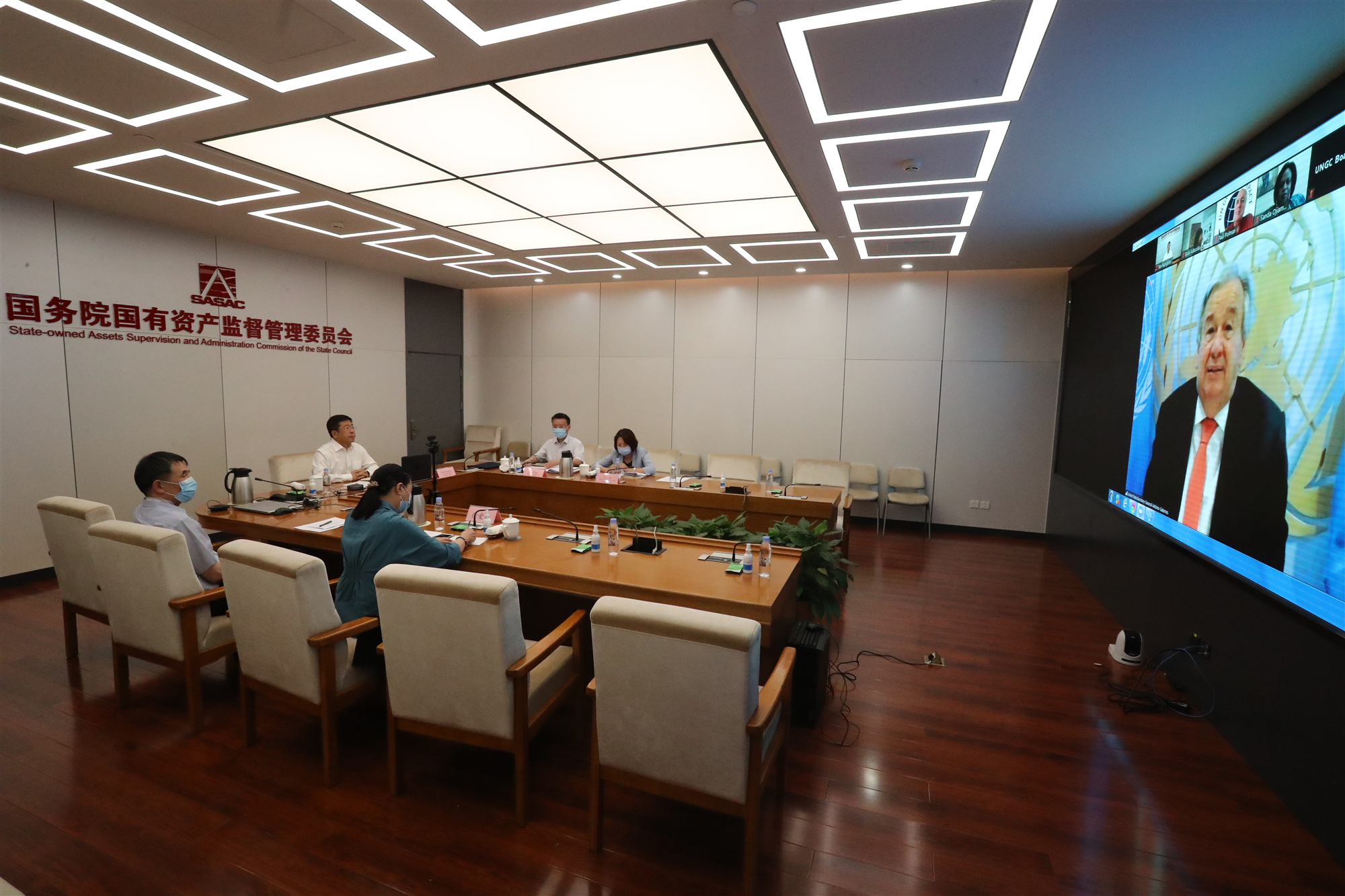 2020年9月11日晚,,,,,团结国全球左券组织(UNGC)理事会聚会在线上举行。。。。。。。团结国秘书长安东尼奥·古特雷斯出席聚会并致辞。。。。。。。国务院国资委副主任任洪斌作为中国唯逐一位团结国全球左券组织理事,,,,,出席聚会并起劲建言献策。。。。。。。